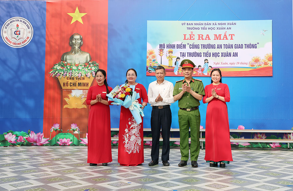 Lãnh đạo UBND xã Nghi Xuân tặng hoa chúc mừng Lễ ra mắt mô hình “Cổng trường an toàn giao thông”.
