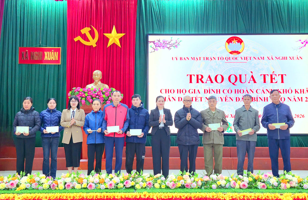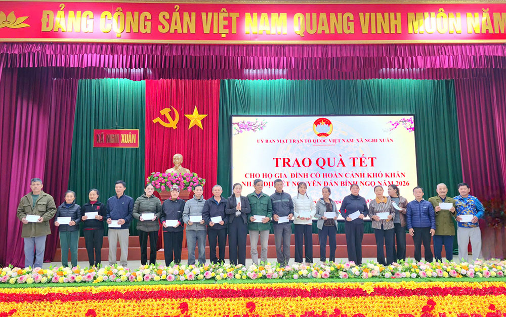Tại chương trình, 364 hộ gia đình hoàn cảnh khó khăn thuộc 39 thôn trên địa bàn xã Nghi Xuân đã được trao tặng 364 suất quà trị giá trên 180 triệu đồng. Số tiền hỗ trợ từ nguồn công Đức Đền chợ Củi thuộc Trung tâm dịch vụ tổng hợp xã Nghi Xuân