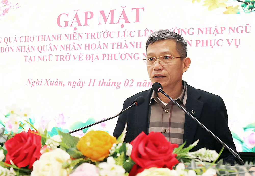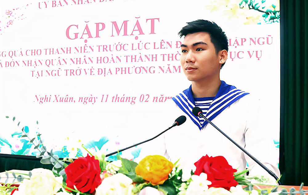 Phát biểu tại buổi gặp mặt, đồng chí Phan Duy Vĩnh, Phó Chủ tịch UBND xã Nghi Xuân mong muốn các tân binh xác định tốt ý thức trách nhiệm, nêu cao bản lĩnh chính trị, kiên định vững vàng, phát huy sức trẻ, vượt qua mọi khó khăn, gian khổ, không ngừng tu dưỡng đạo đức, lối sống, ra sức học tập, rèn luyện hoàn thành xuất sắc mọi nhiệm vụ được giao.